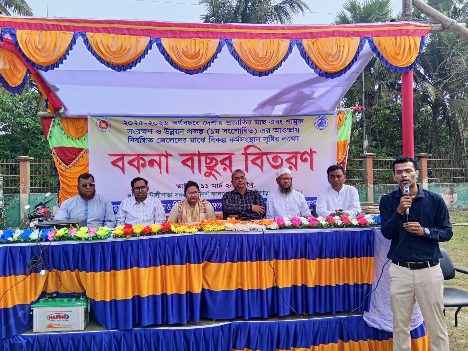গোপালগঞ্জের কোটালীপাড়া উপজেলায় নিবন্ধিত মৎস্যজীবীদের বিকল্প কর্মসংস্থান সৃষ্টির লক্ষ্যে ৬০ জন মৎস্যজীবীর মাঝে ৬০টি বকনা বাছুর বিতরণ করা হয়েছে।আজ বুধবার কোটালীপাড়া আদর্শ সরকারি কলেজ মাঠে দেশীয় প্রজাতির মাছ এবং শামুক সংরক্ষণ প্রকল্পের আওতায় এ সব বকনা বাছুর বিতরণ করা হয়। জেলা সৎস্য অফিসার মোঃ কামরুল ইসলাম প্রধান অতিথি হিসেবে উপস্থিত থেকে বাছুরগুলো বিতরণ করেন। উপজেলা নির্বাহী অফিসার সাগুফতা হকের সভাপতিত্ত্বে অনুষ্ঠিত বকনা বাছুর বিতরণ অনুষ্ঠানে উপজেলা বিএনপির সভাপতি এস এম মহিউদ্দিন,সাধারণ সম্পাদক আবুল বশার হাওলাদার,পৌর বিএনপির সাধারণ সম্পাদক অলিউর রহমান হাওলাদার,উপজেলা কৃষি অফিসার দোলন চন্দ্র রায়,দেশীয় প্রজাতির মাছ এবং শামুক সংরক্ষণ প্রকল্পের সহকারী প্রকল্প পরিচালক আসলাম হোসেন শেখ,সিনিয়র উপজেলা মৎস্য অফিসার শাহজাহান সিরাজ,মৎস্যজীবী হেমায়েত মোল্লা বক্তব্য রাখেন। মৎস্যজীবী হেমায়েত মোল্লা বলেন,দেশীয় প্রজাতির মাছ ও শামুক সংরক্ষণের সময় আমাদের আর বেকার থাকতে হবে না।আমরা অবসর সময়ে এই বাছুর পালন করে সাবলম্বী হতে পারবো। প্রধান অতিথির বক্তব্যে জেলা মৎস্য কর্মকর্তা মোঃ কামরুল ইসলাম বলেন,দেশের মৎস্য সম্পদ রক্ষায় জেলেদের ভূমিকা অপরিসীম। দেশীয় প্রজাতির মাছ ও শামুক সংরক্ষণের সময়ে জেলেদের যেন আয় বন্ধ না হয় সেই উদ্দেশ্যেই সরকার এ বিকল্প কর্মসংস্থানের ব্যবস্থা করেছে।আর সেই বিকল্প কর্মসংস্থান হিসেবে এই বকলা বাছুর বিতরণ করা হচ্ছে।
