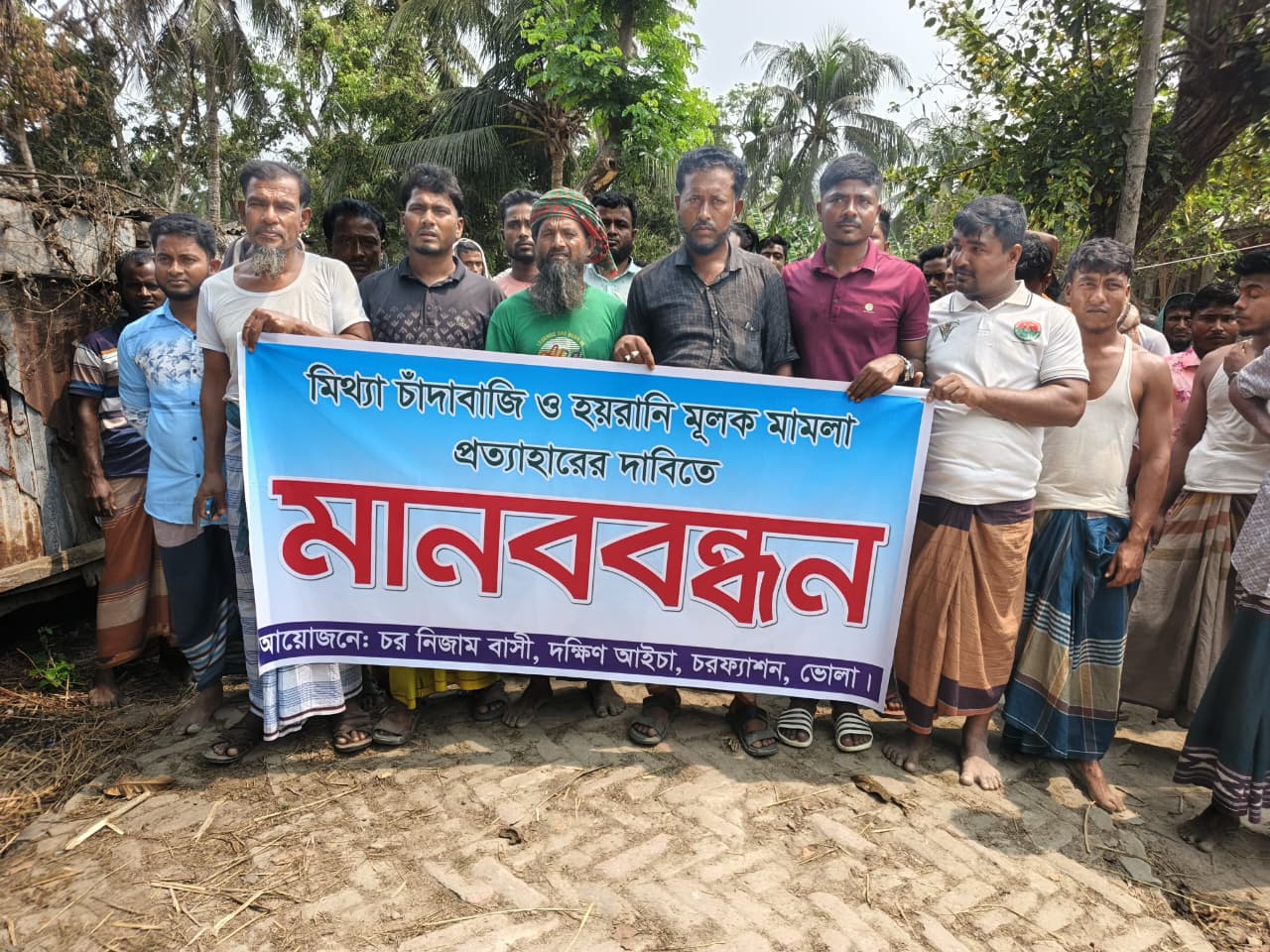 ভোলার চরফ্যাশন উপজেলার দক্ষিণ আইচা থানার বিচ্ছিন্ন দ্বীপ ঢালচরের চরনিজামে ভেসে আসা একটি বিদেশি জাহাজের মালিকানা নিয়ে দুপক্ষের সংঘর্ষের ঘটনায় উল্টো স্থানীয়দের বিরুদ্ধে চাঁদাবাজি মামলা দায়ের করা হয়েছে। সেই মামলা প্রত্যাহারের দাবিতে মানববন্ধন করেছে এলাকাবাসী। বুধবার (১১ মার্চ) দুপুরে উপজেলার বিচ্ছিন্ন দ্বীপ ঢালচর ইউনিয়নের ৮ নম্বর ওয়ার্ডের চরনিজাম এলাকায় মেঘনা নদীর পাড়ে শত শত মানুষ এই মানববন্ধনে অংশ নেন। ঘন্টাব্যাপী মানববন্ধনে মামলার আসামি স্থানীয় বাসিন্দা মাকসুদ সরকার, নুরুল্লাহ ও কালাম চৌধুরী জানান, ২০২২ সালের ১৫ জুলাই সিঙ্গাপুর থেকে আসা আলকুবতান নামের জাহাজটি চরনিজামে ভেসে আসে। এরপর থেকে বিভিন্ন চক্র জাহাজটির মালিকানা দাবি করেছে এবং এর অংশ ও মূল্যবান যন্ত্রপাতি নিয়ে যান। সম্প্রতি ঢাকা থেকে আসা কাজী এমদাদুল হক নামে এক ব্যাক্তি আদালতের মাধ্যমে জাহাজটি নিলামে পেয়েছেন দাবি করে। তিনি জাহাজটি ভাসিয়ে নিয়ে যাওয়ার চেষ্টা করলে অন্য একটি পক্ষের সঙ্গে সংঘর্ষ ও মারামারির ঘটনা ঘটে। এতে স্থানীয়রা সন্দেহ করেন যে এটি একটি প্রতারক চক্রের পরিকল্পনা। তারা জাহাজটি মেরামত ও কেটে নিতে বাঁধা দেন।এতেই ২৭ ফেব্রুয়ারি ২০২৬ তারিখে কাজী এমদাদুল হক বাদী হয়ে দক্ষিণ আইচা থানায় স্থানীয়দের বিরুদ্ধে ৫০ লাখ টাকার চাঁদাবাজি, মোবাইল ছিনতাই ও মারধরের অভিযোগে মামলা করেন। মামলার পর থেকে স্থানীয়রা গ্রামছাড়া হয়ে আছেন।