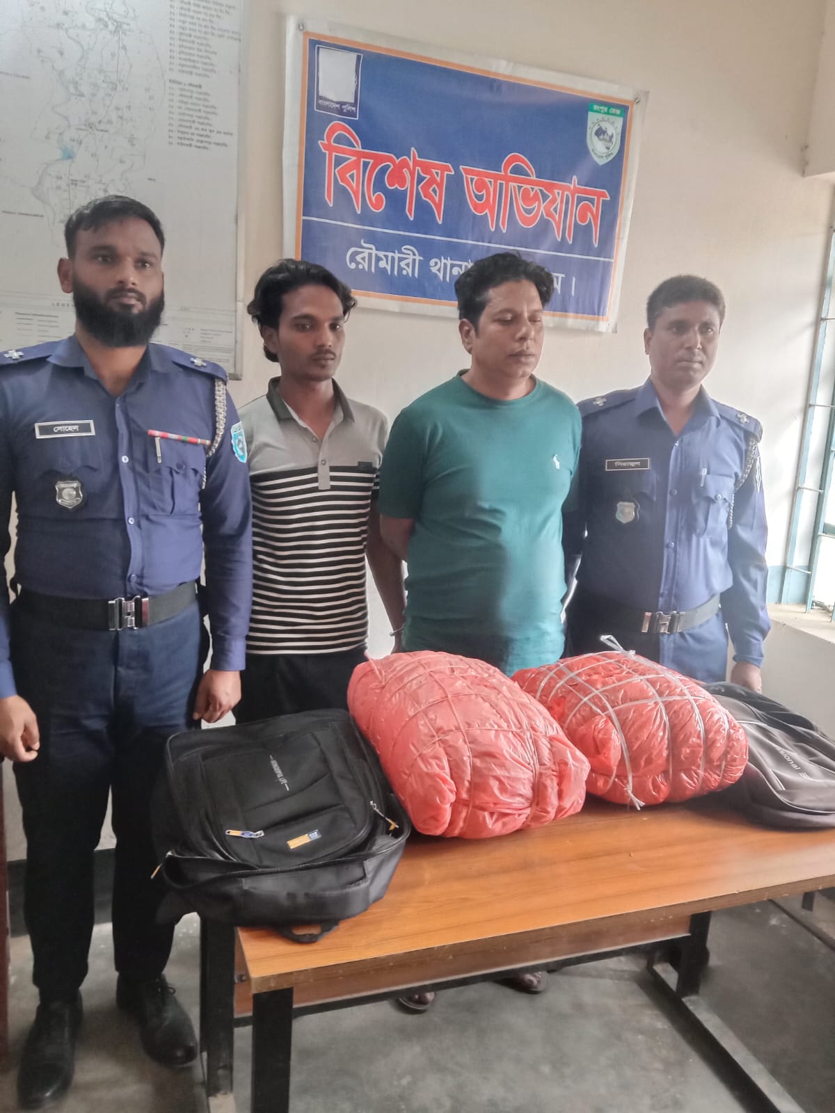 কুড়িগ্রামের রৌমারী উপজেলায় ১২ কেজি ৫০০ গ্রাম গাঁজাসহ দুই মাদক ব্যবসায়ীকে আটক করা হয়েছে। রবিবার (১৫ মার্চ ২০২৬) দুপুর ১টার দিকে রৌমারী থানাধীন রৌমারী সদর এলএসডি গোডাউনের গেইটের সামনে সিএনজি স্ট্যান্ড এলাকায় এ ঘটনা ঘটে।আটককৃতরা হলেন— মোঃ নুরুল ইসলাম (৪৫), পিতা মৃত ময়দান আলী, সাং কাজাই বাদলা, থানা শাহাজাদপুর, জেলা সিরাজগঞ্জ এবং মোঃ রাজু মিয়া (২২), পিতা মোঃ মোবারক হোসেন, সাং শরিয়তপুর, থানা সখিপুর, জেলা শরিয়তপুর।জানা যায়, তারা ভূরুঙ্গামারী থানা এলাকা থেকে ১২ কেজি ৫০০ গ্রাম গাঁজা ক্রয় করে রৌমারী উপজেলা সিএনজি স্ট্যান্ড হয়ে টাঙ্গাইলের এলেঙ্গা যাওয়ার উদ্দেশ্যে রওনা হয়। পরে রৌমারী এলএসডি গোডাউনের সামনে সিএনজি ভাড়া করার সময় সিএনজি চালকদের সন্দেহ হলে তারা দুইটি ব্যাগ তল্লাশি করে গাঁজা দেখতে পান। এরপর স্থানীয়রা তাদের আটক করে থানায় খবর দেন।সংবাদ পেয়ে রৌমারী থানা পুলিশ ঘটনাস্থলে উপস্থিত হয়ে সাক্ষীদের উপস্থিতিতে ব্যাগ দুইটি তল্লাশি করে ১২ কেজি ৫০০ গ্রাম গাঁজা ও দুইটি মোবাইল ফোন জব্দ করে এবং আটককৃতদের থানায় নিয়ে যায়।