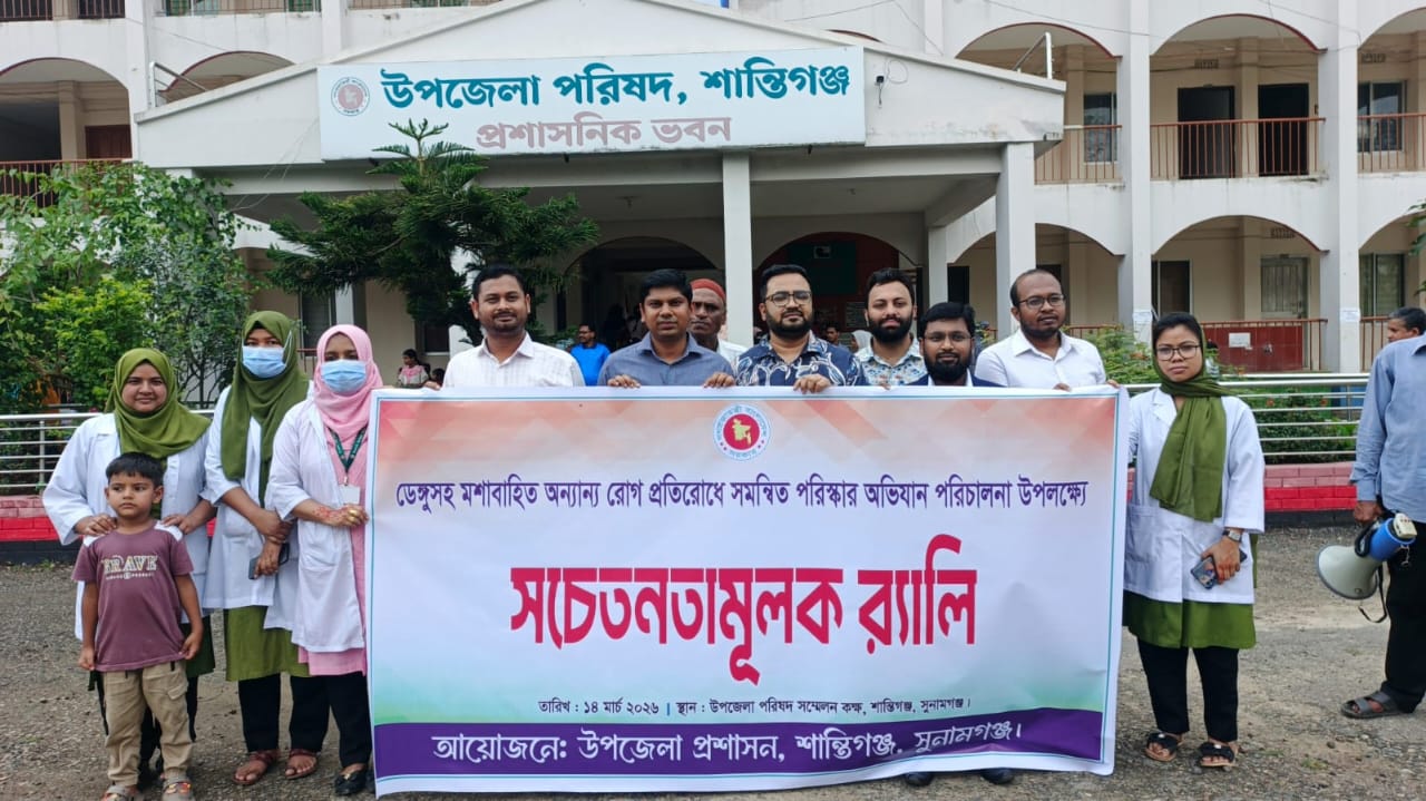 ডেঙ্গুসহ বিভিন্ন মশাবাহিত রোগ প্রতিরোধে সচেতনতা বাড়াতে সুনামগঞ্জের শান্তিগঞ্জ উপজেলায় একটি সচেতনতামূলক র্যালি অনুষ্ঠিত হয়েছে।শানিবার(১৪ মার্চ) সকাল ১১.০০ ঘটিকায় শান্তিগঞ্জ উপজেলা প্রশাসনের উদ্যােগে উপজেলা নির্বাহী কর্মকর্তা মোহাম্মদ শাহজাহান এর সভাপতিত্বে এবং উপজেলা স্বাস্থ্য ও পরিবার পরিকল্পনা কর্মকর্তা ডা. ইকবাল হাসান এর পরিচালনায় ডেঙ্গুসহ মশাবাহিত অন্যান্য রোগ প্রতিরোধে সমন্বিত পরিস্কার অভিযান পরিচালনা উপলক্ষ্যে এই সচেতনতামূলক র্যালি কর্মসূচিটির আয়োজন করা হয়।এসময় উপস্থিত ছিলেন শান্তিগঞ্জ উপজেলা কৃষি কর্মকর্তা আহসান হাবিব, থানা ভারপ্রাপ্ত কর্মকর্তা(ওসি) ওলি উল্লাহ, পশ্চিম বীরগাঁও ইউনিয়ন পরিষদের চেয়ারম্যান লুৎফুর রহমান জায়গীরদার খোকন, ইয়াকুব আলী সরকারি প্রাথমিক বিদ্যালয়ের প্রধান শিক্ষক মানিক লাল চক্রবর্তী, ইউপি সদস্য মছকু মিয়া, লিটন মিয়া সহ উপজেলা প্রশাসন ও স্বাস্থ্য কমপ্লেক্সের কর্মকর্তা কর্মচারীবৃন্দ।এছাড়া র্যালিতে উপজেলার বিভিন্ন শিক্ষাপ্রতিষ্ঠানের শিক্ষার্থীরা অংশগ্রহণ করেন। অংশগ্রহণকারীদের উপস্থিতিতে র্যালিটি প্রাণবন্ত ও সচেতনতামূলক পরিবেশ সৃষ্টি করে।