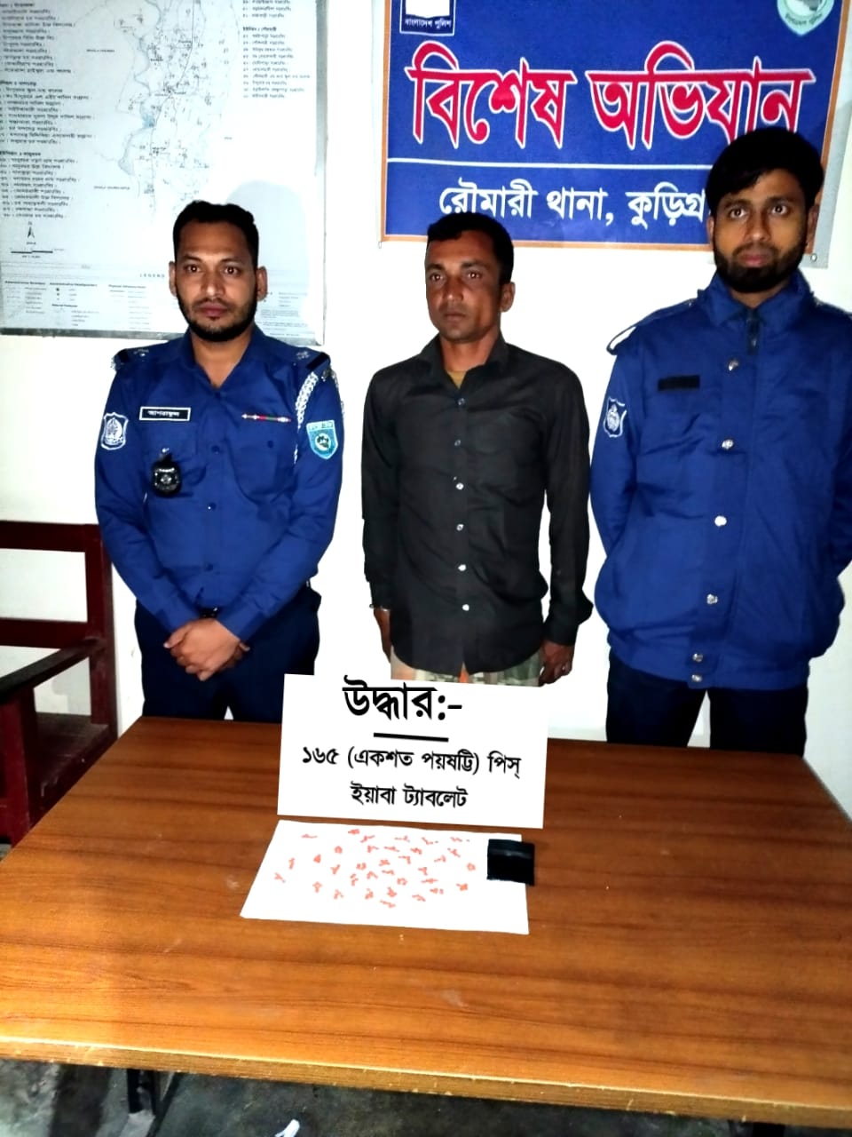 পুলিশ সূত্রে জানা যায়, সোমবার (১৬ মার্চ ২০২৬) রাত ১টা ৫০ মিনিটে রৌমারী থানা পুলিশের এসআই (নিরস্ত্র) আল হাসিব আরমান সঙ্গীয় অফিসার ও ফোর্সের সহায়তায় মাদকদ্রব্য উদ্ধার বিশেষ অভিযান পরিচালনা করেন। গোপন সংবাদের ভিত্তিতে উপজেলার ৩ নং বন্দবেড় ইউনিয়নের উত্তর ফলুয়ার চর গ্রামের বাসিন্দা মো. ফারুক মিয়ার বাড়ির সামনে কাঁচা রাস্তার উপর অভিযান চালানো হয়।এ সময় কুটিরচর খানপাড়া গ্রামের বাসিন্দা মো. আসাদুল ইসলাম (৩০), পিতা– মো. ছবির খানকে আটক করা হয়। তল্লাশির সময় তার কাছ থেকে ১৬৫ পিস ইয়াবা ট্যাবলেট উদ্ধার করা হয়। পরে সাক্ষীদের উপস্থিতিতে জব্দ তালিকা প্রস্তুত করে ইয়াবাগুলো পুলিশ হেফাজতে নেওয়া হয়।এ ঘটনায় গ্রেফতারকৃত আসামির বিরুদ্ধে রৌমারী থানায় মামলা দায়ের করা হয়েছে। মামলা নম্বর ১৮/৩৮, তারিখ ১৬ মার্চ ২০২৬; ধারা ৩৬(১) সারণির ১০(ক), মাদকদ্রব্য নিয়ন্ত্রণ আইন ২০১৮।