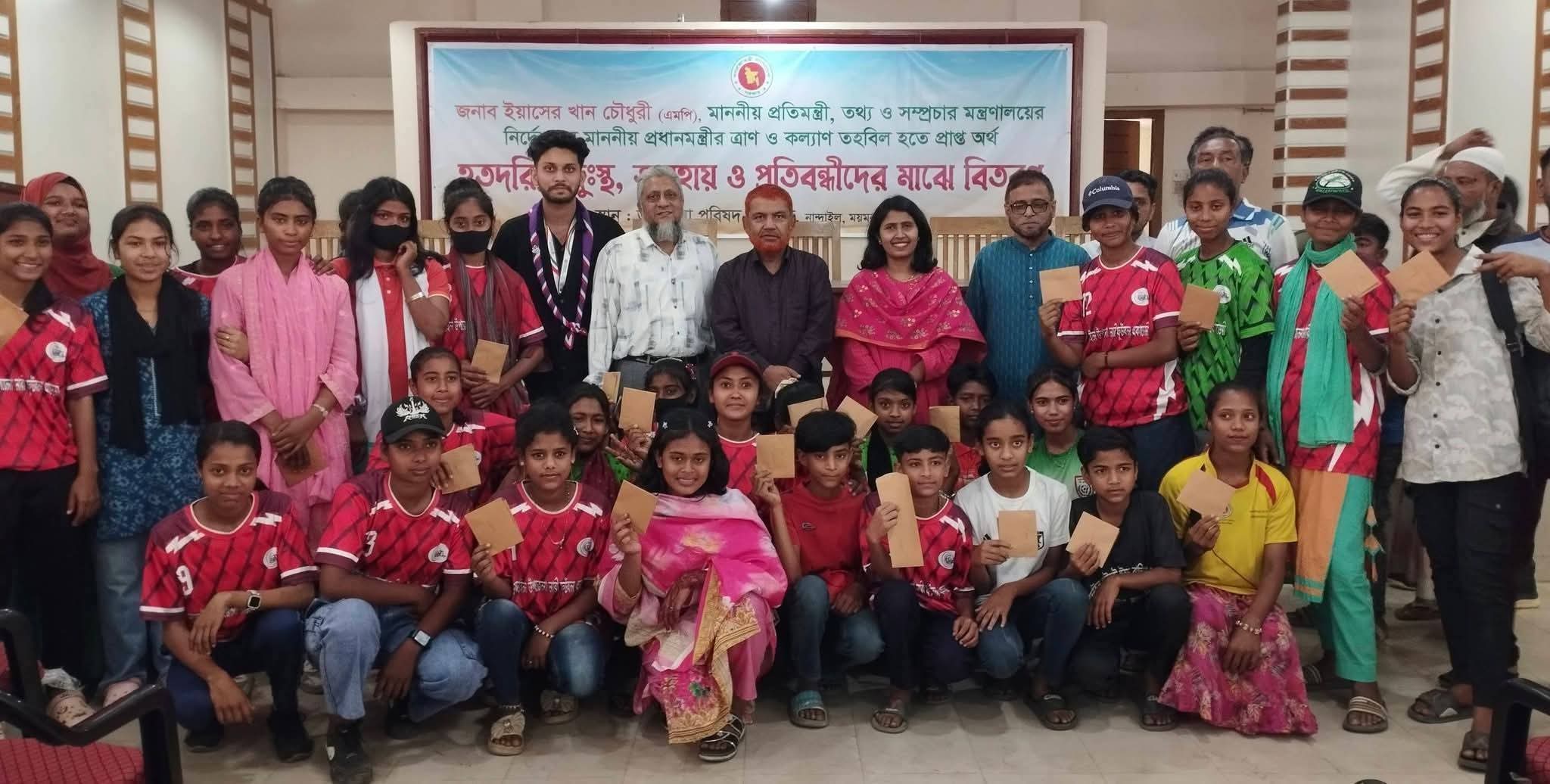 নান্দাইল আসনের সংসদ সদস্য তথ্য ও সম্প্রচার প্রতিমন্ত্রী ইয়াসের খান চৌধুরী এমপির নির্দেশনায় উপজেলা নির্বাহী কর্মকর্তা (ইউএনও) ফাতেমা জান্নাতের সভাপতিত্বে আয়োজিত এ অনুষ্ঠানে উপস্থিত ছিলেন উপজেলা বিএনপির সিনিয়র যুগ্ম-আহ্বায়ক মিজানুর রহমান লিটন, শহীদ স্মৃতি আদর্শ সরকারি কলেজের ভারপ্রাপ্ত অধ্যক্ষ এনামুল হক এবং চন্ডিপাশা সরকারি উচ্চ বিদ্যালয়ের ভারপ্রাপ্ত প্রধান শিক্ষকসহ স্থানীয় গণ্যমান্য ব্যক্তিবর্গ।অনুষ্ঠানে বক্তারা বলেন, প্রধানমন্ত্রীর ত্রাণ তহবিল সবসময় দেশের অসহায় ও দুঃস্থ মানুষের পাশে দাঁড়িয়েছে। বিশেষ করে সমাজের পিছিয়ে পড়া জনগোষ্ঠী, প্রতিবন্ধী ব্যক্তি এবং নারী ক্রীড়াবিদদের সহায়তায় এ ধরনের উদ্যোগ অত্যন্ত প্রশংসনীয়। তারা আরও বলেন, সরকারের এ মানবিক কার্যক্রম সামাজিক নিরাপত্তা নিশ্চিতকরণে গুরুত্বপূর্ণ ভূমিকা রাখছে এবং অসহায় মানুষের মাঝে স্বস্তি ফিরিয়ে আনছে।