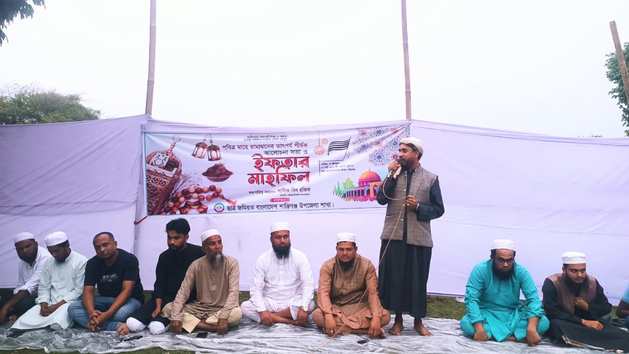 সুনামগঞ্জের শান্তিগঞ্জে ছাত্র জমিয়ত বাংলাদেশ শান্তিগঞ্জ উপজেলা শাখার উদ্যোগে পবিত্র মাহে রমজানের তাৎপর্য শীর্ষক আলোচনা সভা ও ইফতার মাহফিল অনুষ্ঠিত হয়েছে। বুধবার (১৮ মার্চ) বিকেলে উপজেলার সুলতানপুর করচ বাগান মাঠে এ আলোচনা সভা ও ইফতার মাহফিলের আয়োজন করা হয়। উপজেলা ছাত্র জমিয়তের সভাপতি সালিক বিন রফিকের সভাপতিত্বে এবং প্রচার সম্পাদক নাবিল খাঁন ও নির্বাহী সদস্য হাবিবুল্লাহ হামিদের যৌথ সঞ্চালনায় অনুষ্ঠানে প্রধান অতিথি হিসেবে বক্তব্য রাখেন উপজেলা জমিয়তের সহ-সভাপতি মাওলানা আব্দুল্লাহ।প্রধান বক্তা হিসেবে বক্তব্য দেন সুনামগঞ্জ জেলা ছাত্র জমিয়তের সাবেক সাংগঠনিক সম্পাদক মুফতী নূর আহমেদ চুয়াপুরী। বিশেষ অতিথি হিসেবে বক্তব্য রাখেন উপজেলা জমিয়তের যুগ্ম সাধারণ সম্পাদক ও সাবেক ভাইস চেয়ারম্যান পদপ্রার্থী মাওলানা জাহাঙ্গীর খাঁন, সুনামগঞ্জ সদর উপজেলা জমিয়তের সাধারণ সম্পাদক মাওলানা রমজান হোসাইন, উপজেলা জমিয়তের অর্থ সম্পাদক ও উপজেলা ছাত্র জমিয়তের সাবেক সভাপতি জাকারিয়া মাহবুব, উপজেলা বিএনপির আহ্বায়ক কমিটির নির্বাহী সদস্য মহির উদ্দীন মহির, শান্তিগঞ্জ প্রেসক্লাবের সাধারণ সম্পাদক মো. নুরুল হক এবং উপজেলা ছাত্র জমিয়তের সিনিয়র সহ-সভাপতি কামরান আহমেদ।