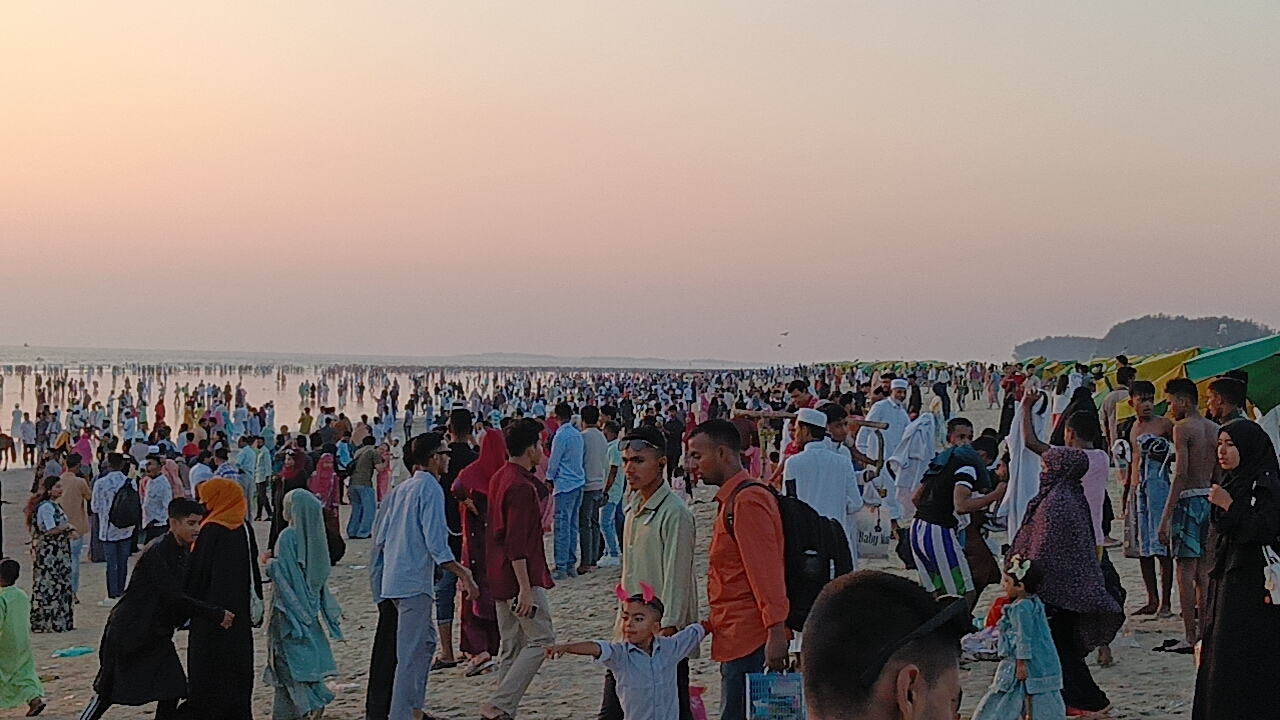 সৈকতের বালিয়াড়ি আর পর্যটকের ভিড়ে পুরো এলাকা যেন একাকার হয়ে উঠে। সৈকতের পাশাপাশি হোটেল -মোটেল এলাকায়, সড়ক ও বিনোদনকেন্দ্রগুলোতে ও উপচে পড়া ভিড় লক্ষ্য করা গেছে। ঈদের লম্বা ছুটি ভ্রমণে আসা পর্যটক স্বাভাবিক সময়ের তুলনায় কয়েকগুন বেশি পর্যটকের উপস্থিতি দেখা গেছে। সোমবার সকাল থেকে দেশের বিভিন্ন প্রান্ত থেকে আসা পর্যটকদের আগমন শুরু হয় যা বিকেলের দিকে আরও বেড়ে যায়। সূর্যোদয় ও সূর্যাস্তের জন্য বিখ্যাত এই সৈকতের লাবনী পয়েন্ট থেকে কলাতলী পয়েন্ট পর্যন্ত ছিল পর্যটকের মুখরতা। কেউ সমুদ্রে সাঁতার কাটছেন, কেউ সৈকতে বসে উপভোগ করছেন প্রাকৃতিক সৌন্দর্য। আবার অনেকে ঘোড়ার গাড়িতে ও অন্যান্য যানবাহনে চড়ে এলাকা ঘুরে দেখছেন।
