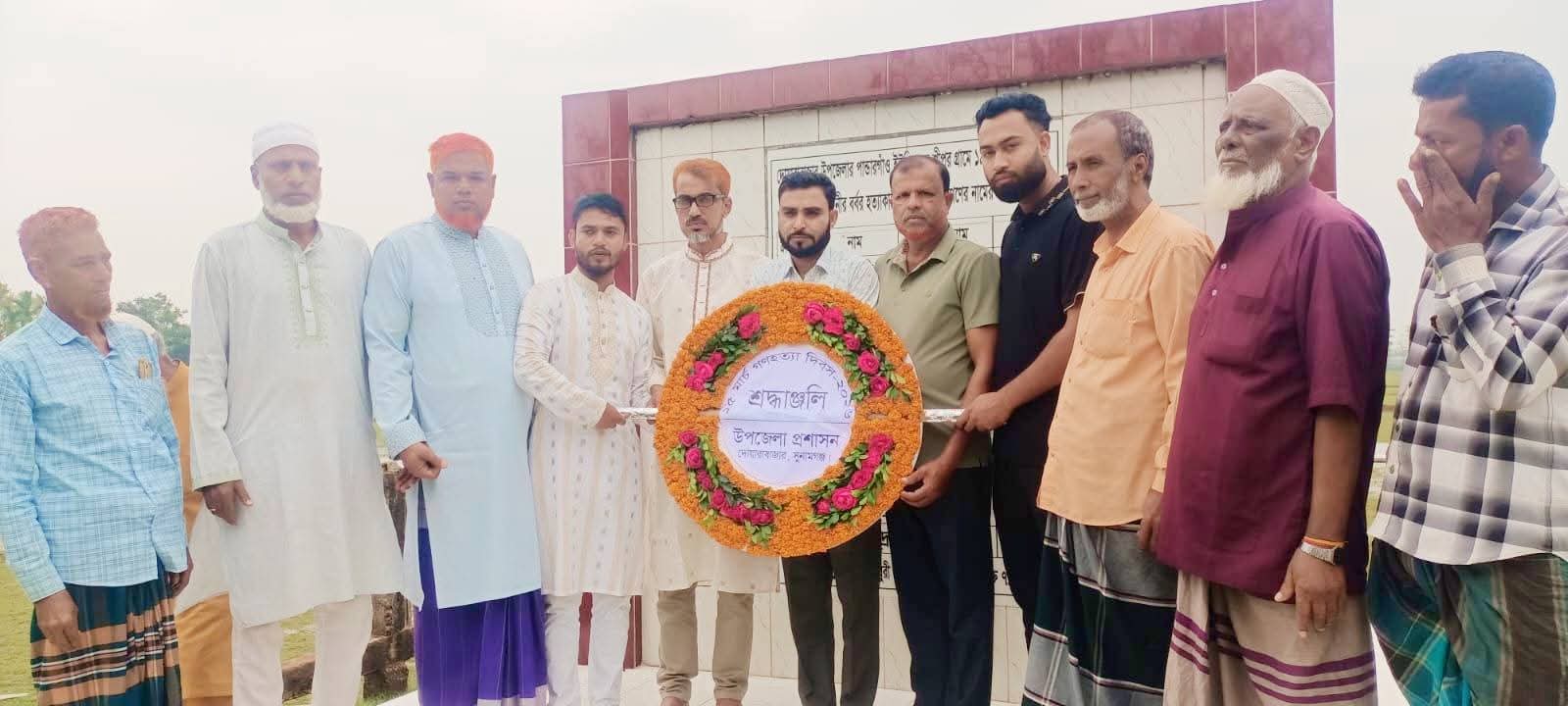 আজ দোয়ারাবাজার উপজেলার পান্ডারগাও ইউনিয়নস্থ শ্রীপুর বধ্যভূমিতে উপজেলা প্রশাসনের পক্ষ থেকে পুষ্পস্তবক অর্পণ করা হয়েছে। উপজেলা পরিসংখ্যান অফিসার জনাব মুশাহিদ আলী মামুন উপজেলা প্রশাসনের পক্ষে স্থানীয় গণ্যমান্য ব্যক্তিদের নিয়ে সকাল ৯.০ টায় পুষ্পস্তবক অর্পণ করেন।এই সময় উপস্থিত ছিলেন উপজেলা বিএনপির ১ম যুগ্ম আহ্বায়ক জনাব আব্দুল মানিক মাস্টার,উপস্থিত ছিলেন:পান্ডার গাঁও ইউনিয়ন বি এন পির আহবায়ক কমটি যুগ্ন আহবায়ক অলিউর রহমান, আর উপস্থিত ছিলেন: পান্ডার আহবায়ক কমটি সদস্য আরশ আলী, রুনু মিয়া,পান্ডার গাঁও ইউনিয়ন বি এন পি নেতা রইছ মিয়া,পান্ডার গাঁও ইউনিয়ন যুবদল নেতা মোশাহিদ আলী, সুনামগঞ্জ জেলা বিপ্লবী দলের আহবায়ক এমদাদ হোসাইন,পান্ডার গাঁও ইউনিয়ন যুবদল নেতা সুজন মিয়া। আরো উপস্থিত ছিলেন এলাকার গণ্যমান্য ব্যক্তিগন।