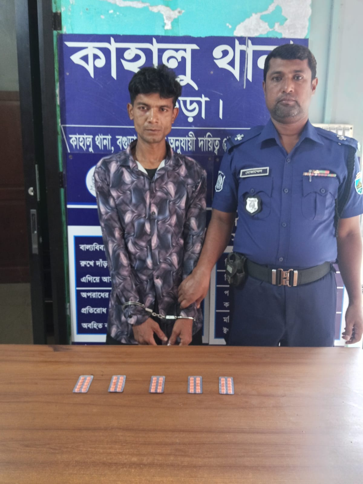 বগুড়ার কাহালু উপজেলায় মাদকবিরোধী বিশেষ অভিযানে ৫০ পিস টেপেন্টাডল ট্যাবলেটসহ এক ব্যক্তিকে গ্রেফতার করেছে কাহালু থানা পুলিশ।পুলিশ সূত্রে জানা যায়, অদ্য ১লা এপ্রিল ২০২৬ তারিখ সকাল ০৭টায় সময় গোপন সংবাদের ভিত্তিতে কাহালু থানার নবাগত অফিসার ইনচার্জ (ওসি)মোঃ শফিকুল ইসলাম-এর দিকনির্দেশনায় এএসআই মোঃ মোজাম্মেল হক সঙ্গীয় ফোর্সসহ মাদকবিরোধী অভিযান পরিচালনা করেন।অভিযানকালে কাহালু থানার অন্তর্গত কাইট গ্রামে জনৈক মোঃ শফিকুল ইসলাম মেম্বার-এর বসতবাড়ির সামনে পাকা রাস্তার ওপর থেকে মোঃ রফিকুল ইসলাম রফিক মোল্লা (৩৫)-কে গ্রেফতার করা হয়। তিনি কাহালু উপজেলা কাইট মধ্যপাড়া এলাকার মৃত আব্দুল খালেক মোল্লা-র ছেলে।এ সময় তার কাছ থেকে ৫০ পিস মাদকদ্রব্য টেপেন্টাডল ট্যাবলেট উদ্ধার করা হয় বলে পুলিশ জানায়।কাহালু থানা পুলিশ আরও জানায়,গ্রেফতারকৃত ব্যক্তির বিরুদ্ধে মাদকদ্রব্য নিয়ন্ত্রণ আইনে একটি নিয়মিত মামলা করা হয়েছে। পরবর্তীতে আজ সকালেই তাকে বিজ্ঞ আদালত, বগুড়ায় সোপর্দ করা হয়েছে।এ বিষয়ে কাহালু থানার অফিসার ইনচার্জ (ওসি) মোঃ শফিকুল ইসলাম বলেন, মাদকের বিরুদ্ধে এ ধরনের অভিযান অব্যাহত থাকবে এবং সমাজ থেকে মাদকের বিস্তার রোধে পুলিশ আরও কঠোর অবস্থানে রয়েছে।স্থানীয় সচেতন মহল নবাগত ওসির এ ধরনের অভিযানকে স্বাগত জানিয়ে বলেন,যুব সমাজকে মাদকের ভয়াল থাবা থেকে রক্ষায় নিয়মিত অভিযান আরও জোরদার করা প্রয়োজন।