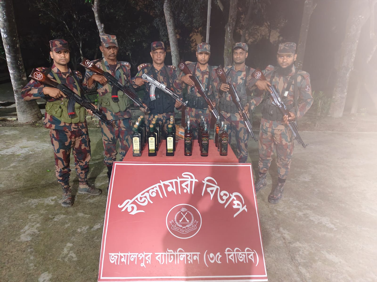 মাদকের বিরুদ্ধে বিন্দুমাত্র ছাড় নয়" এমন মনোভাবকে সামনে রেখে জামালপুর ব্যাটালিয়নের (৩৫ বিজিবি) অধিনায়ক হাসানুর রহমান, বিজিওএম, পিএসসি এর সার্বিক দিক নির্দেশনায় মাদকবিরোধী অভিযান পরিচালনা করে নিম্নবর্ণিত মালামাল আটক করা হয়:১। অদ্য ০১ এপ্রিল ২০২৬ তারিখ আনুমানিক রাত ১২:০০ ঘটিকায় নিজস্ব গোয়েন্দা তথ্যের ভিত্তিতে জামালপুর ব্যাটালিয়নের (৩৫ বিজিবি) অধিনস্থ ইজলামারী বিওপি কর্তৃক মাদক বিরোধী অভিযান পরিচালনাকালে সীমান্ত পিলার ১০৬৬/এমপি হতে আনুমানিক ১০০০ গজ বাংলাদেশের অভ্যন্তরে বন্ধুরচর নামক স্থান হতে আসামীবিহীন ভারতীয় মদ-২৪ বোতল আটক করতে সক্ষম হয়। যার সিজার মূল্য- ৩৬,০০০/- (ছত্রিশ হাজার) টাকা। জব্দকৃত ভারতীয় মদ রৌমারী থানায় জিডি করতঃ ধ্বংস করার নিমিত্তে ব্যাটালিয়ন সদরে জমা করার কার্যক্রম প্রক্রিয়াধীন।২। অদ্য ০১ এপ্রিল ২০২৬ তারিখ আনুমানিক রাত ০১:০০ ঘটিকায় নিজস্ব গোয়েন্দা তথ্যের ভিত্তিতে জামালপুর ব্যাটালিয়নের (৩৫ বিজিবি) অধিনস্থ বড়াইবাড়ী বিওপি কর্তৃক মাদক বিরোধী অভিযান পরিচালনাকালে সীমান্ত পিলার ১০৬৮/২-এস হতে আনুমানিক ৫০০ গজ বাংলাদেশের অভ্যন্তরে চুলিয়ারচর নামক স্থান হতে আসামীবিহীন ভারতীয় মদ-৪০ বোতল এবং রিবোফ্লভিন ট্যাবলেট-১০০০ পিস আটক করতে সক্ষম হয়। যার সিজার মূল্য- ২,১০,০০০/-(দুই লক্ষ দশ হাজার) টাকা। জব্দকৃত ভারতীয় মদ এবং ঔষধ রৌমারী থানায় জিডি করতঃ ধ্বংস করার নিমিত্তে ব্যাটালিয়ন সদরে জমা করার কার্যক্রম প্রক্রিয়াধীন।বিজিবি মহাপরিচালক মহোদয় কর্তৃক ঘোষিত মাদক ও চোরাচালনের বিরুদ্ধে জিরো টলারেন্স নীতি বাস্তবায়নের লক্ষ্যে সীমান্তে মাদক ও সকল ধরনের চোরাচালান পাচার রোধকল্পে এবং সীমান্ত সুরক্ষায় দৃঢ়তার সাথে দায়িত্ব পালন করে যাচ্ছে জামালপুর ব্যাটালিয়ন (৩৫ বিজিবি)।