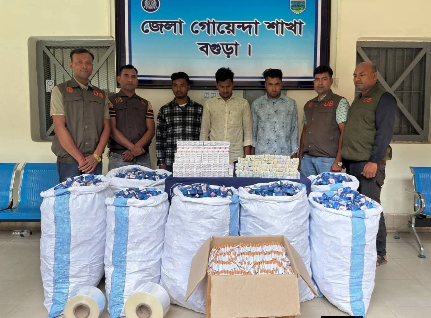 বগুড়ার শিবগঞ্জ উপজেলায় অবৈধ সিগারেট কারখানায় জেলা গোয়েন্দা (ডিবি) পুলিশের বিশেষ অভিযানে ৩ জনকে গ্রেফতার করা হয়েছে। এসময় ৭৩ হাজার নকল রাজস্ব স্ট্যাম্প যার আনুমানিক মূল্য প্রায় ৬৪ লাখ ৫০ হাজার টাকা, উদ্ধার করা হয়। পাশাপাশি নকল ডার্বি ও স্টার ব্র্যান্ডের সিগারেট, খালি প্যাকেট এবং তৈরির বিভিন্ন সরঞ্জাম জব্দ করা হয়েছে।পুলিশ সূত্রে জানা যায়, একটি ভাড়া বাসায় দীর্ঘদিন ধরে চক্রটি নকল সিগারেট তৈরি করে আসছিল এবং এর মাধ্যমে সরকারি রাজস্ব ফাঁকি দিচ্ছিল।গোপন সংবাদের ভিত্তিতে পরিচালিত এ অভিযানে ডিবি পুলিশ তাদের আটক করতে সক্ষম হয়।এ ঘটনায় বিশেষ ক্ষমতা আইন ১৯৭৪ ও ট্রেডমার্ক আইন ২০০৯ অনুযায়ী মামলা দায়ের করা হয়েছে। গ্রেফতারকৃতদের আদালতে পাঠানো হয়েছে বলে জানিয়েছে পুলিশ।