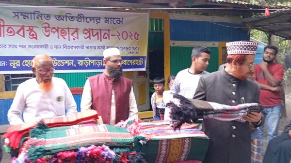৬ নং গাড়িপাড়ায় নূর হোসেন ফাউন্ডেশনের উদ্যোগে শতাধিক মানুষের মাঝে শীতবস্ত্র বিতরণ কচুয়া উপজেলা প্রতিনিধি মোঃ সাইফুল ইসলাম ১৩ ডিসেম্বর:বাগেরহাট জেলা কচুয়া উপজেলার) ৬ নং রাড়ীপাড়া ইউনিয়নে ‘নূর হোসেন