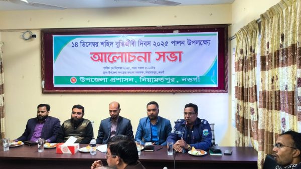 নওগাঁর নিয়ামতপুরে শহীদ বুদ্ধিজীবী দিবস পালিত মোঃ আব্দুল আজিজ নওগাঁঃ আজ ১৪ ডিসেম্বর রোজ রবিবার শহিদ বুদ্ধিজীবী দিবস উপলক্ষে উপজেলা প্রশাসনের আয়োজনে উপজেলা নির্বাহী অফিসার এর সভা কক্ষে আলোচনা সভা