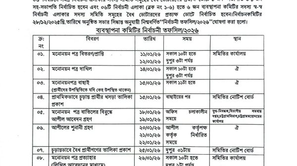 নার্গিস আক্তার (ব্রাহ্মণবাড়িয়া) ব্রাহ্মণবাড়িয়ার নবীনগর উপজেলা কেন্দ্রীয় সমবায় সমিতি লিমিটেডের ব্যবস্থাপনা কমিটির নির্বাচনের তফসিল ঘোষণা করা হয়েছে। আগামী ৩ ফেব্রুয়ারি ২০২৬ (মঙ্গলবার) সকাল ১০টা থেকে বিকেল ৩টা পর্যন্ত সমিতির নিজস্ব