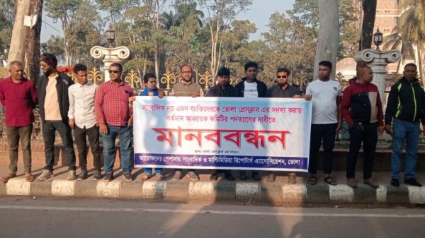 সাংবাদিক নয় এমন ব্যাক্তিদের কে ভোলা প্রেসক্লাবের সদস্য করায় আহ্বায়ক কমিটির পদত্যাগের দাবিতে পেশাদার সাংবাদিকদের মানববন্ধন