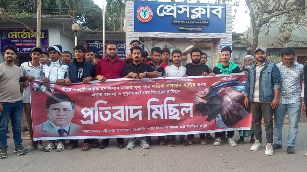 হাদীর উপর হামলার ঘটনায় নবীনগরে বিএনপি’র প্রতিবাদ মিছিল