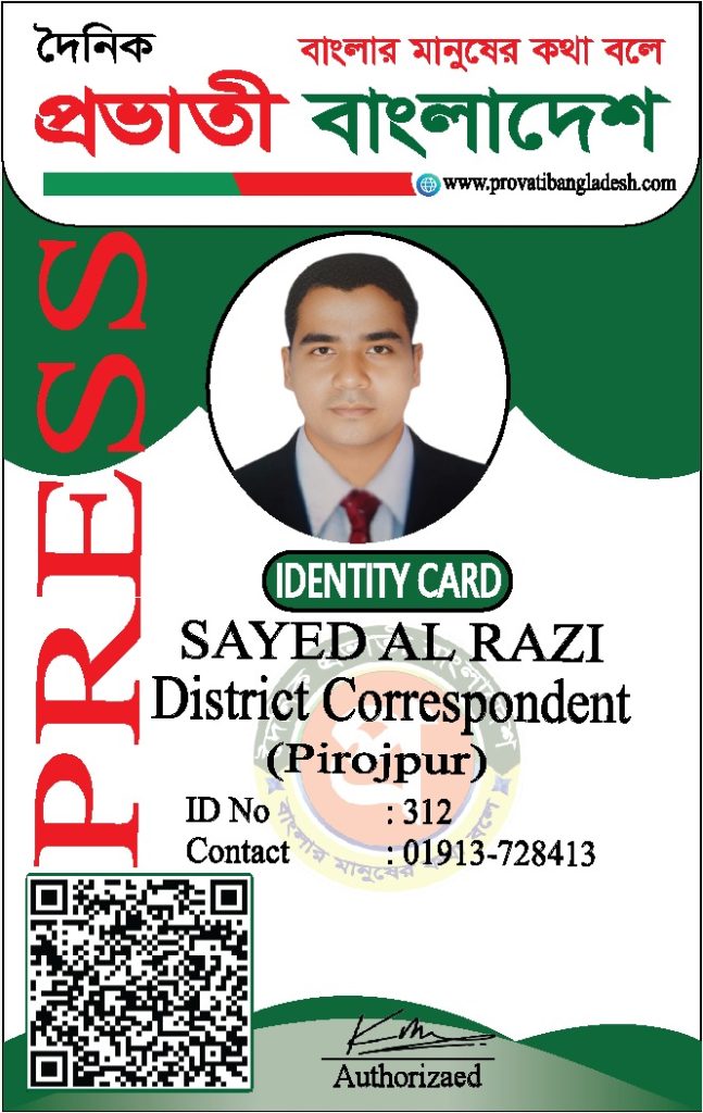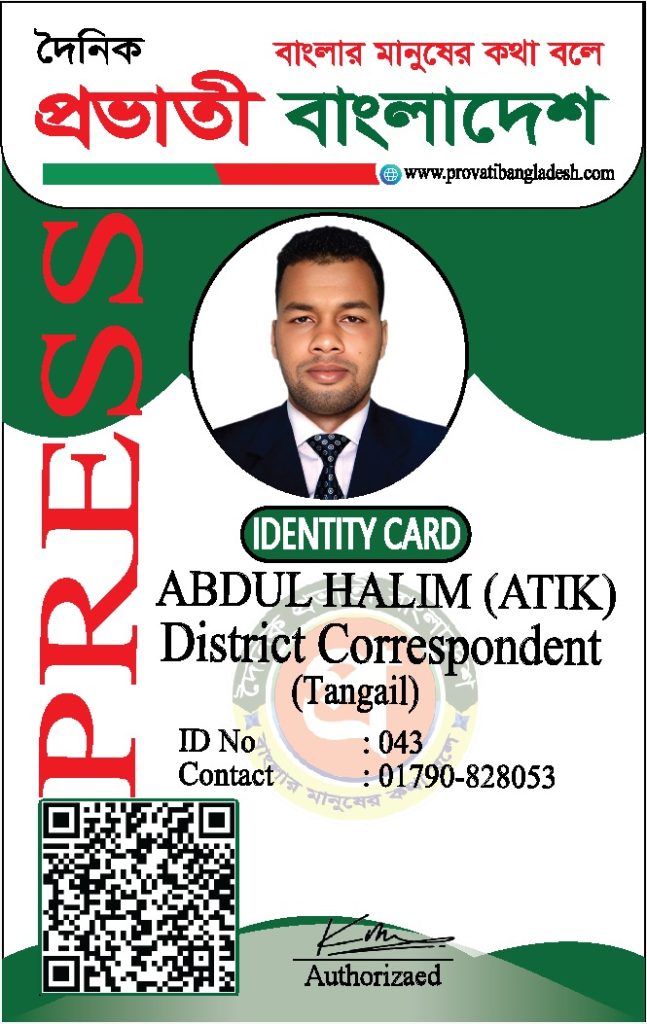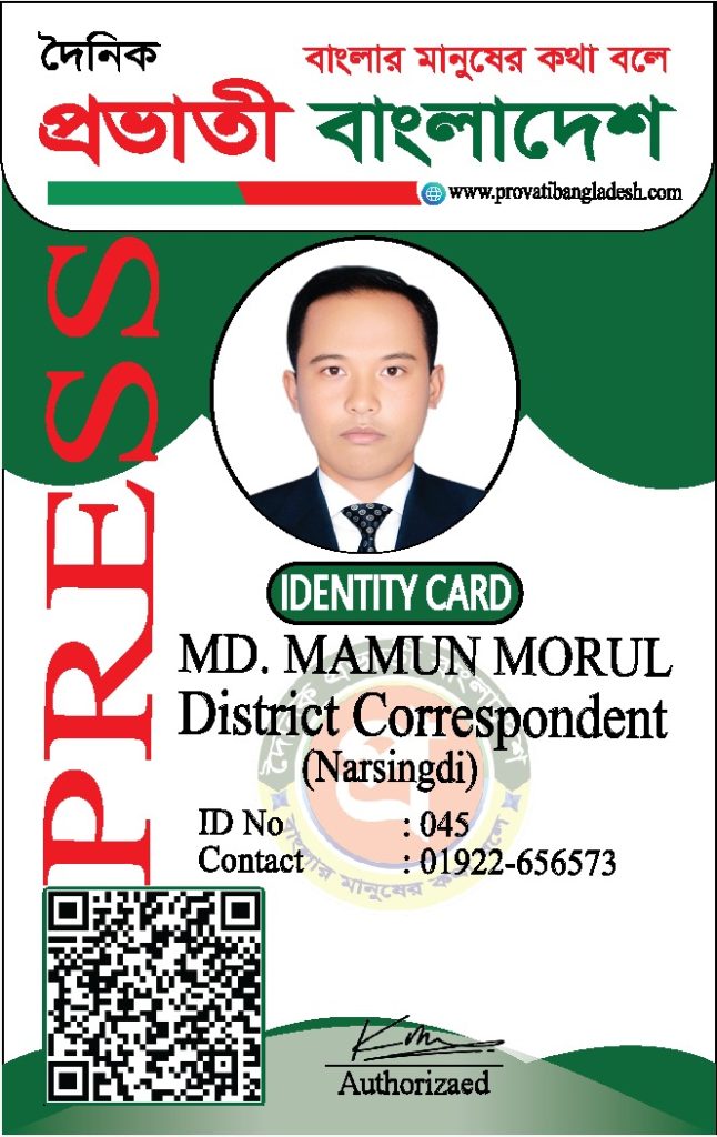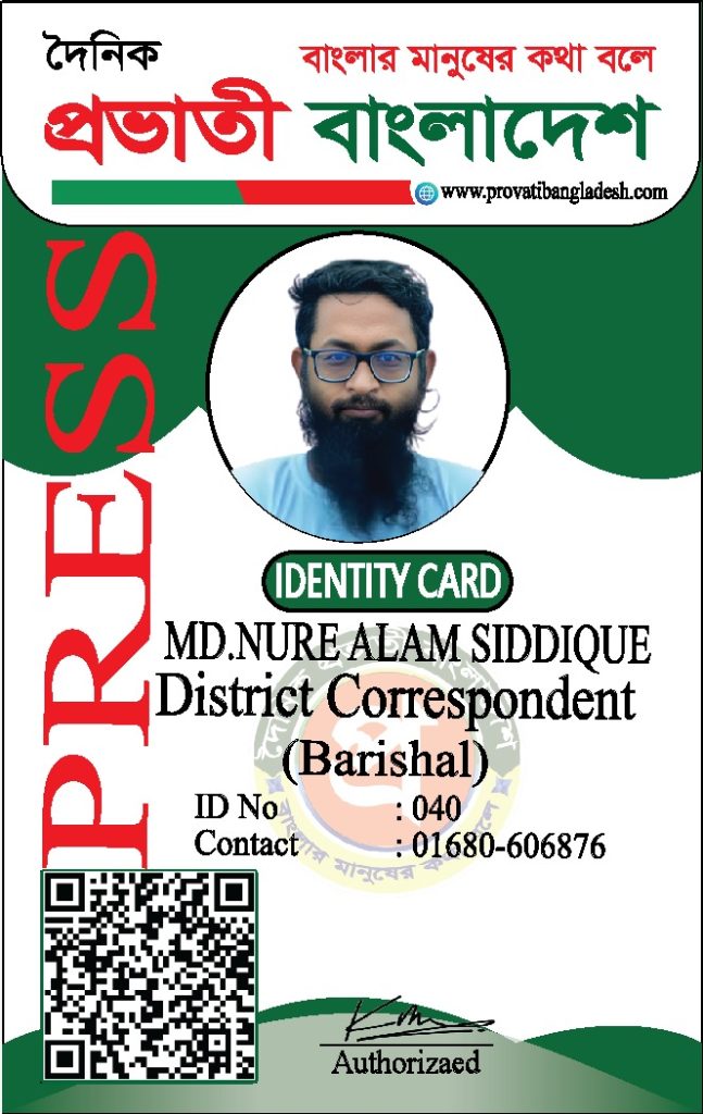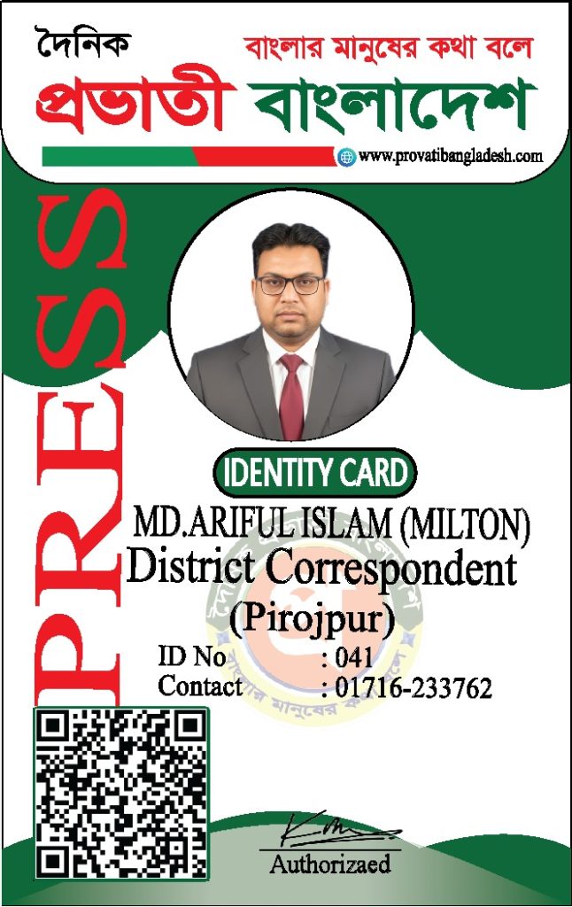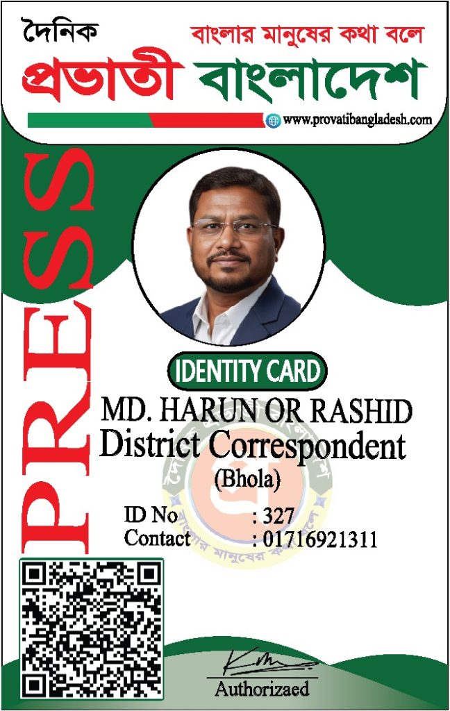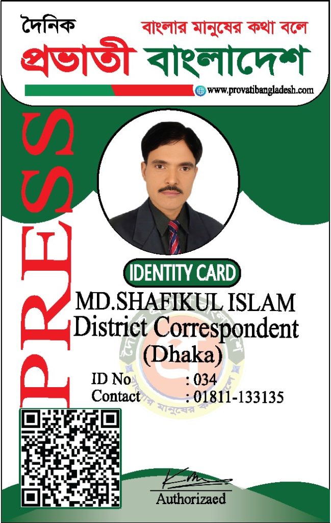 যদি কোনো ব্যক্তির আইডি কার্ডের ছবি আমাদের ওয়েবসাইটে যুক্ত না থাকে, তবে তাকে ‘দৈনিক প্রভাতী বাংলাদেশ’ কর্তৃক কোনো পরিচয়পত্র প্রদান করা হয়নি।